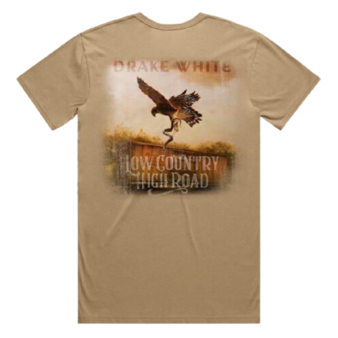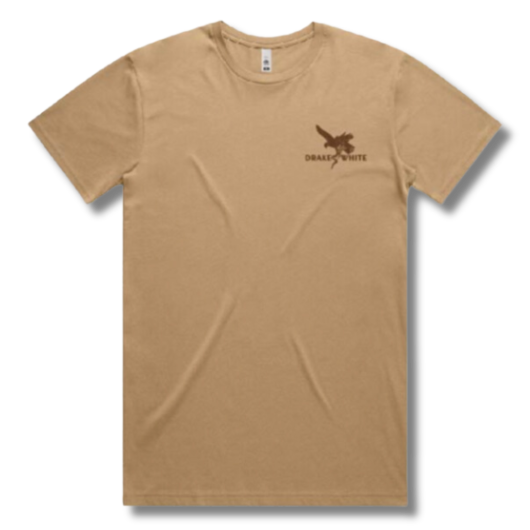 This light brown tee features some hawk artwork with "Drake White" printed on the front left chest.