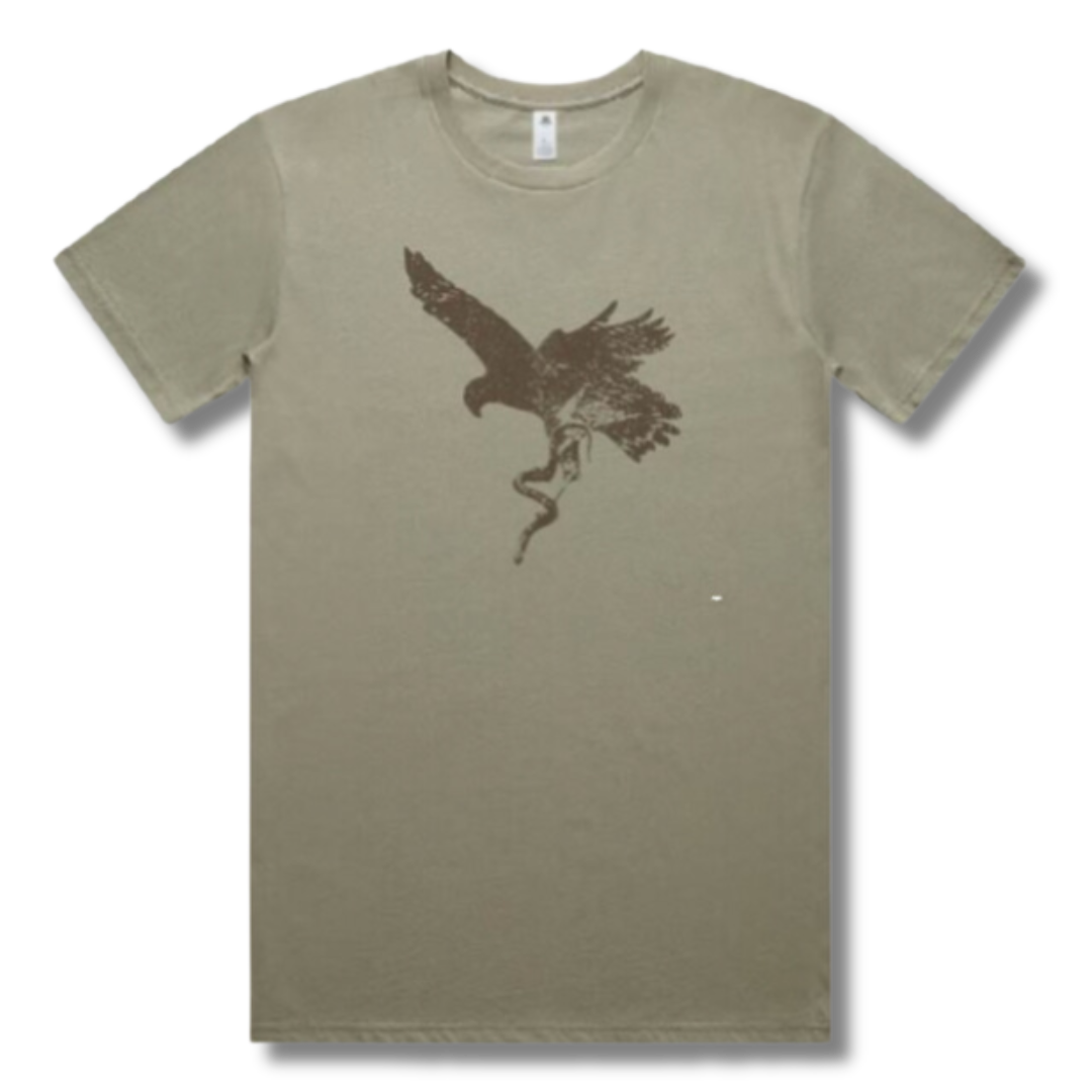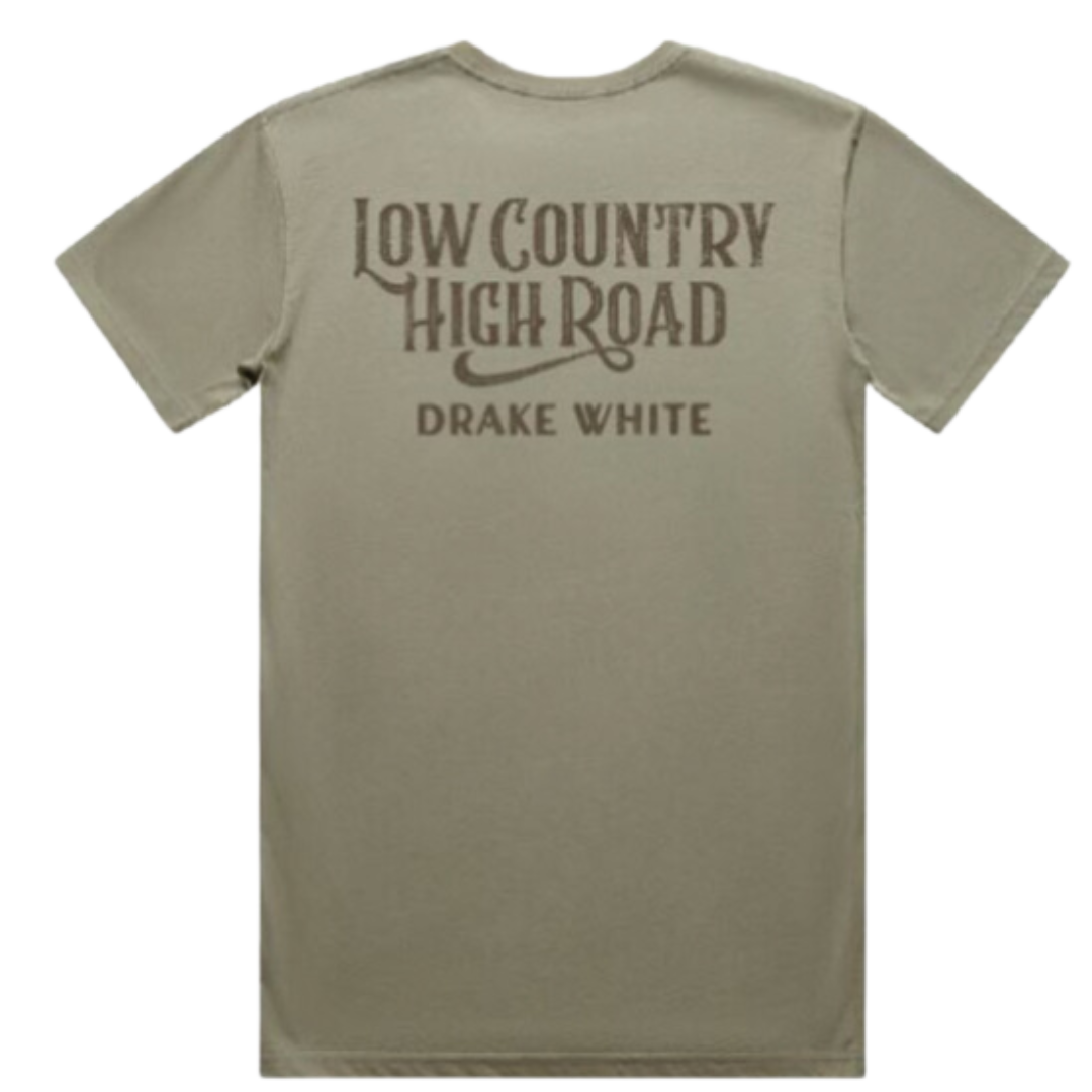 This green tee features a hawk design printed on the front and some text that reads, "Low Country High Road Drake White," printed on the back.